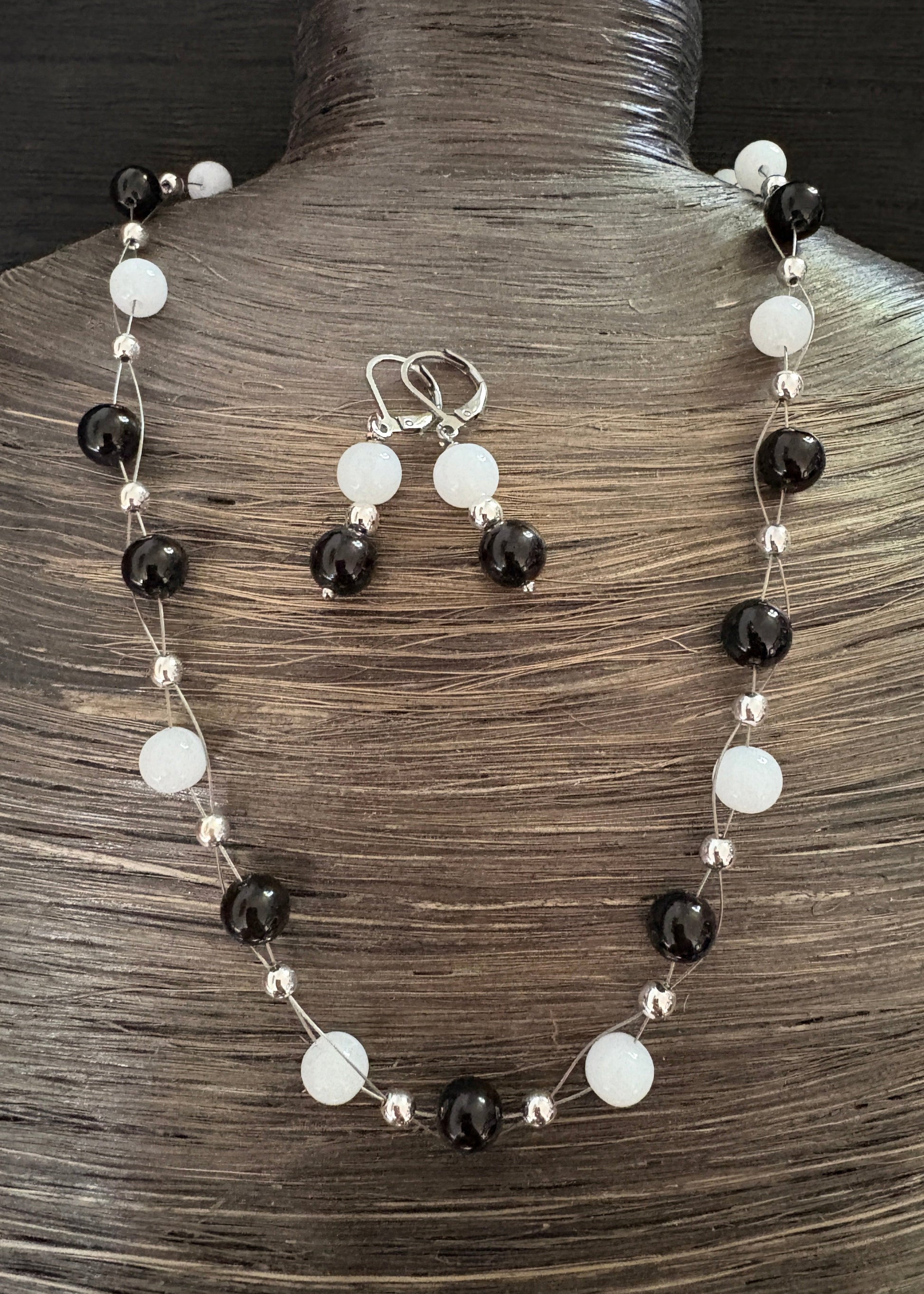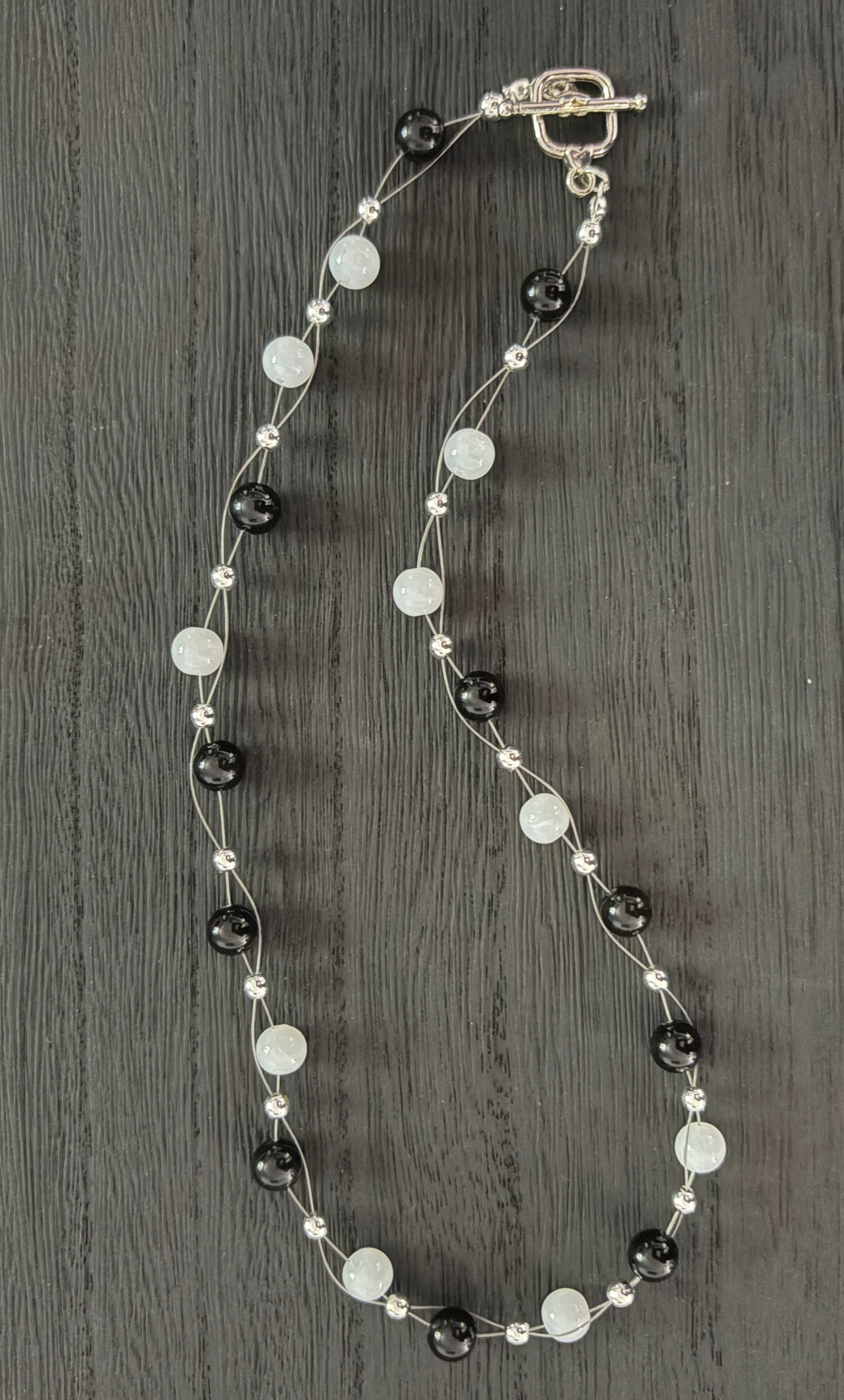 Materials: hematite silver plated beads, black obsidian round beads, white acrylic round beads, silver square clasp