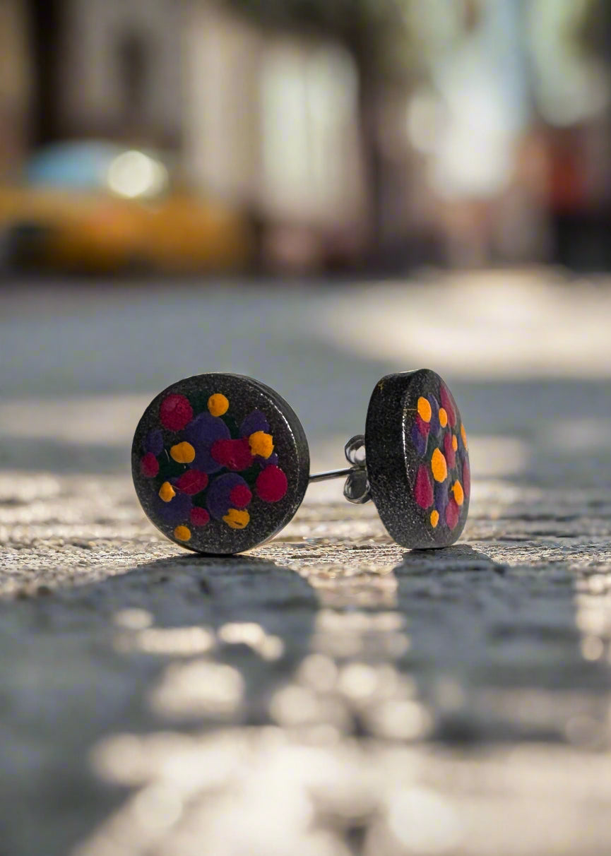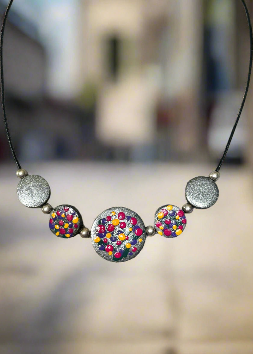 Confetti - Playful, vibrant, and full of joy, our Confetti set captures the spirit of celebration. Hand-painted with colorful dots against a silver backdrop, each piece becomes a wearable burst of festivity.